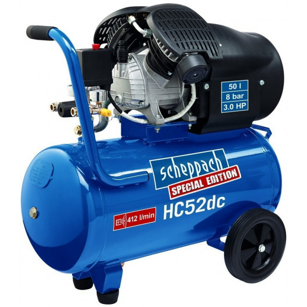 Dvojvalcový olejový kompresor HC 52 DC je výborným pomocníkom do dielne pre každého náročného majstra. Vďaka veľkému obsahu vzdušníka nájde uplatnenie aj v mnohých remeselných dielňach. Pumpa stroja je mazaná olejom, čo predlžuje životnosť celého stroja a to aj pri častom používaní. Kompresor je vybavený optickým ukazovateľom stavu pre jednoduchú kontrolu oleja. Vzdušník slúži ako zásobáreň stlačeného vzduchu a motor sa tak zapína len vtedy, keď tlak vzduchu klesne pod požadovanú úroveň. Dvojvalcový motor s vysokým (maximálnym) výkonom 3 HP má na starosti opätovné natlakovanie veľkej nádrže s objemom 50 litrov. S kompresorom môžete mimo bežného hustenia a ofukovania vykonávať aj náročnejšie operácie s použitím rôznych druhov pneumatického náradia a to vďaka veľkému objemu vzdušníka. Je kompatibilný aj pre pripojenie umývacej pištole, striekacej pištole, pieskovacej trysky a iné. Pri dofukovaní pneumatík oceníte jednoduché nastavenie výšky tlaku, ktorý možno jednoducho kontrolovať pomocou prehľadného manometra Prídavná rukoväť a kolieska poskytujú ľahkú manipuláciu so strojom.