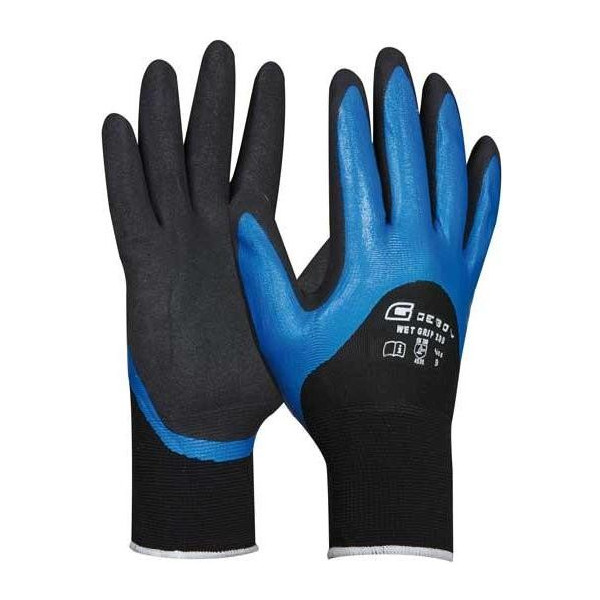 Pracovné rukavice Gebol Wet Grip 200, profesionálna kvalita vyrobená z nylonu s nitridovým povlakom 3/4 a dodatočným nitrilovým pieskovým poťahom na vnútornej strane, dobrá pevnosť a spoľahlivosť, bezpečné uchopenie, odpudzujúci olej a vodu, vysoká odolnosť proti oderu vďaka dvojitému poťahovaniu, veľmi dobré uchopenie mokrých predmetov.